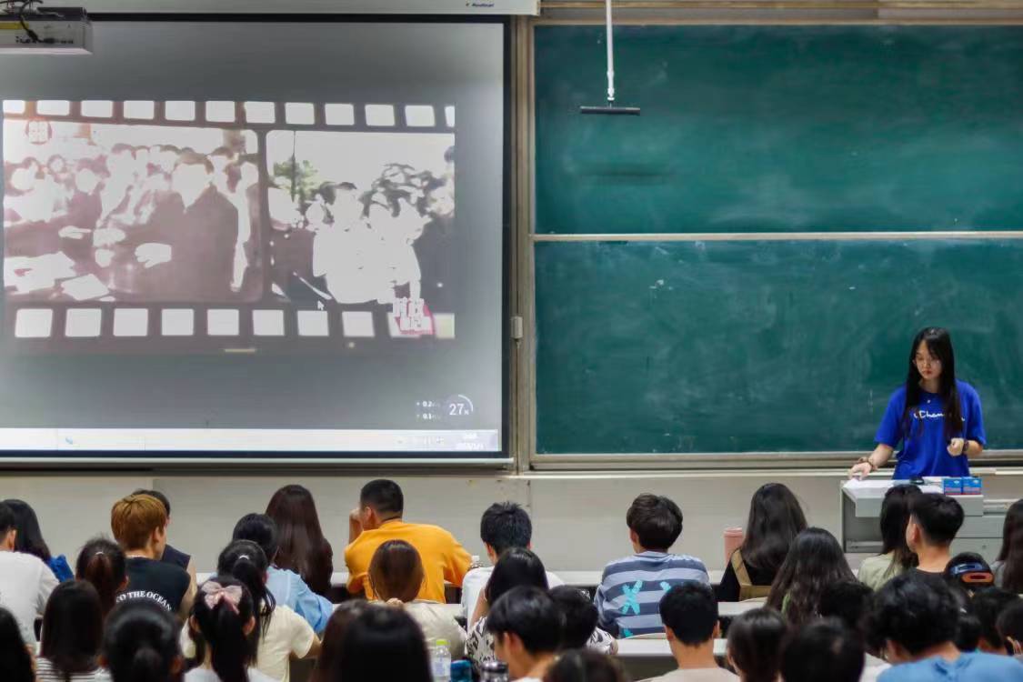 图为王楠带领同学们观看《习近平与大学生朋友们》报道视频