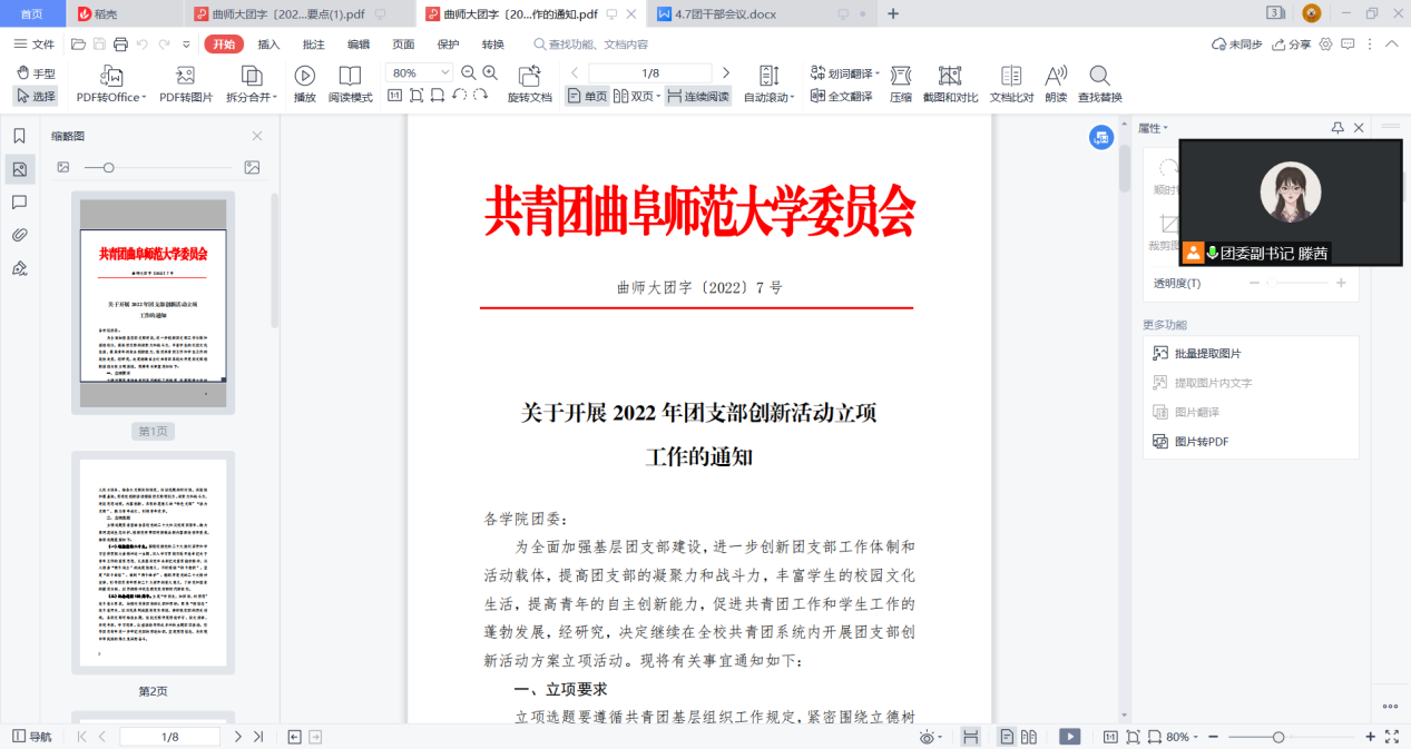 会议伊始,团委副书记滕茜带领解读“关于开展 2022 年团支部创新活动立项工作的通知”文件,就立项选题及活动形式展开具体讲述。接下来,团委书记王亚平作发言总结。王亚平首先针对创新立项活动,强调其重要性及团干部的责任,各团支部应结合学科特色,根据学校要求,发动团支部全体成员参与本次活动。此外,王亚平还强调各团支部青年大学习的完成观看率,督促团支部成员及时完成。随后,由舒一然、孙铖婧就创新立项活动进行经验分享。会议最后,滕茜说明本次活动安排并再次强调活动重要性及宣传,号召各团支部需要在疫情防控措施要求及安全的基础上,有序准备立项活动,团支书积极带领团干部真正落实。