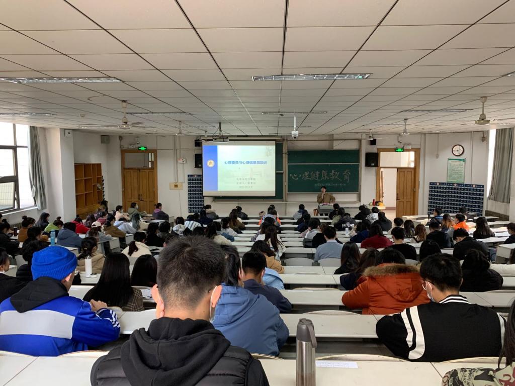 心理健康服务部成员、各班心理委员与心理信息员于综合楼206参加心理健康教育培训,心理辅导员黄秉帅主讲。