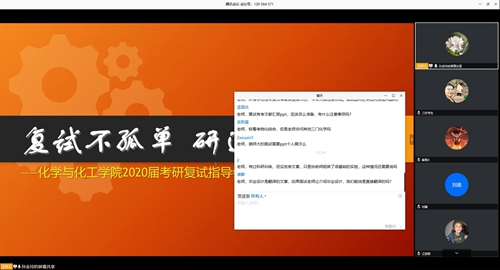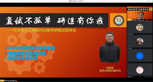 “复试不孤单,研途有你我”——2020届考研复试指导会通过腾讯会议形式线上进行。复试指导会由化院团委书记、2016级辅导员孙金玲主持,特邀研究生招生办公室副主任刘宪伟、ACG漫画网