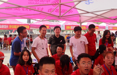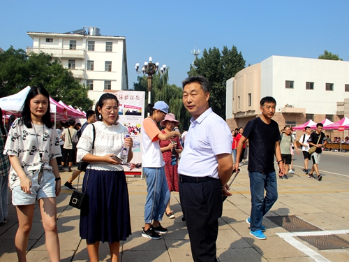 2019年迎新工作在科技实验大楼前如火如荼的进行着。党委副书记毛永正、2018级辅导员冯德浩、2019级辅导员王亚平亲临现场,慰问工作人员和志愿者,对迎新工作进行指导。