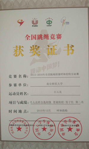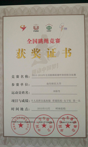 弦歌不辍,桃李芬芳。赛场竞技,展我辈风采。 2015年12月由中国体育总局社会体育指导中心、中国大学生体育协会、中国中学生体育协会共同主办的全国跳绳联赛在内蒙古呼和浩特成功举办。