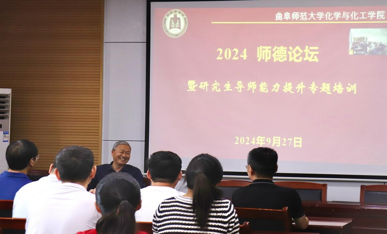 2024年师德论坛暨研究生导师能力提升专题培训在化学楼226会议室顺利举行。学院党委书记赵琪、副院长李平、荣休教师田来进教授、山东省优秀研究生指导教师应安国教授以及40多位青年教师和辅导员参加,会议通过线上和线下的方式举行,由学院工会主席岳明波教授主持。