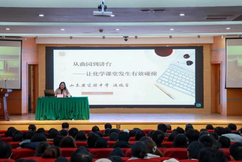会议伊始,汲晓芳以“从曲园到讲台——让化学课堂发生有效碰撞”为题,结合自身从教经历展开分享。她从实习重要性、听课环节、备课要点入手,详细讲解了课堂教学考核标准与不同课型特点,并通过具体案例分析了师生互动、板书设计等常见问题。整场报告内容翔实、案例鲜活,现场气氛热烈,同学们纷纷表示对即将到来的实习有了更清晰的认识,进一步坚定了从教信念。