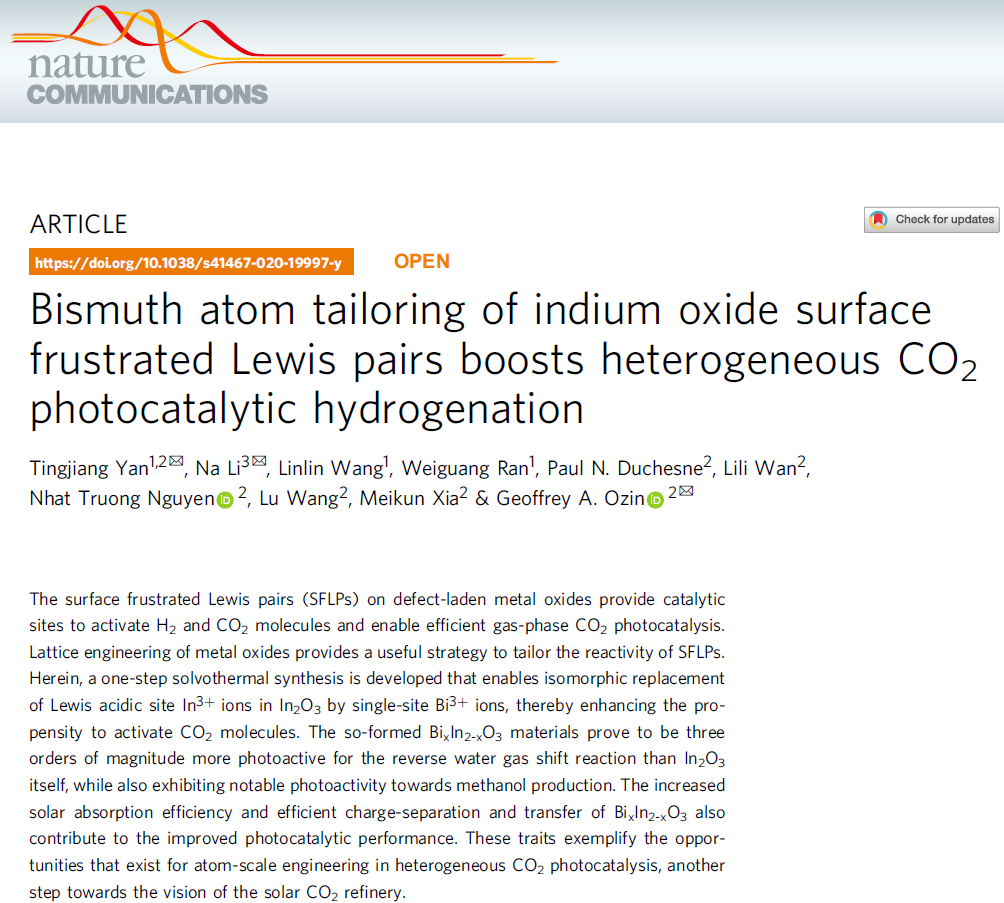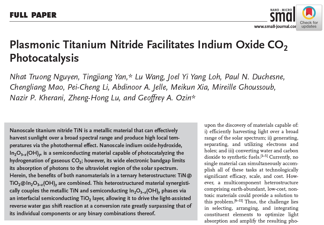 2020年11月,颜廷江教授与Ozin教授继续合作,将SFLPs型In2O3-x(OH)y与具有金属特性的TiN材料耦合,经过煅烧处理后,所得复合催化材料TiN@TiO2@In2O3−x(OH)y可以在较宽的光谱范围内收集阳光,并透过光热效应产生高的局部温度,使其能够以极大超过单个组分或任何二元组分的转化率驱动光激活水气变换反应。相关研究成果以“Plasmonic Titanium Nitride Facilitates Indium Oxide CO2 Photocatalysis”为题发表在国际著名刊物Small(影响因子11.459)。ACG漫画网