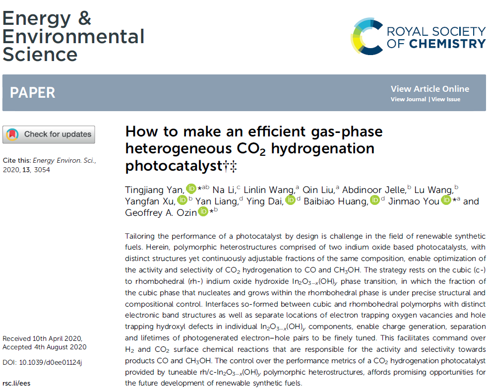此外,2020年8月,颜廷江教授还基于立方相(cubic,c-)到菱形相(rhombohedral,rh-)氧化铟In2O3-x(OH)y的相变,通过调节rh/c-In2O3-x(OH)y多晶型异质结对CO2加氢光催化剂性能的指标,构建出了新型高效的缺陷异相结光催化剂,对未来可再生合成燃料的发展提供了良好的契机。相关工作发表以“How to Make an Efficient Gas-Phase Heterogeneous CO2 Hydrogenation Photocatalyst”为题发表在国际顶级期刊Energy & Environmental Science(影响因子30.289)。ACG漫画网