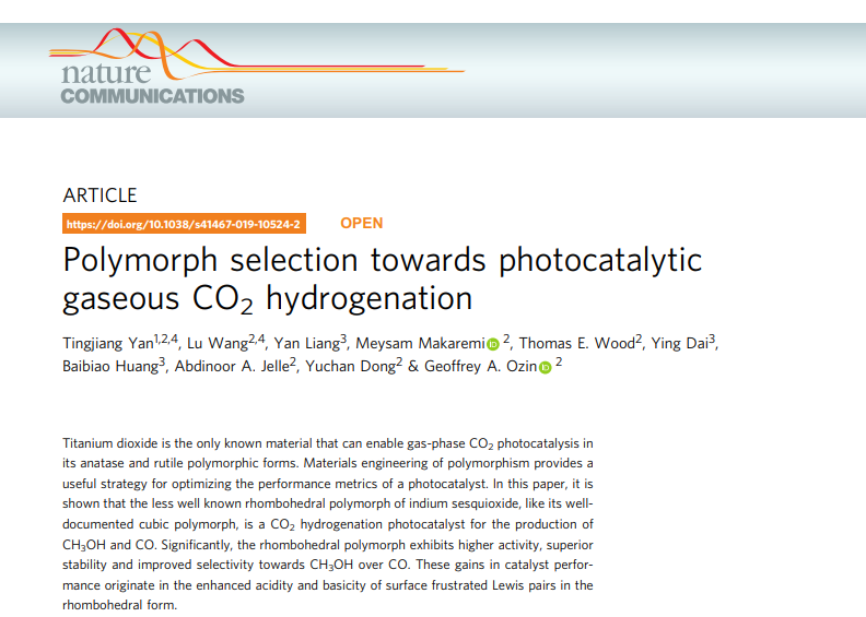 第一篇论文为“Polymorph selection towards photocatalytic gaseous CO2 hydrogenation”(DOI:10.1038/s41467-019-10524-2)发表在《自然》子刊《Nature Communications》上,颜廷江教授为该论文的第一作者与通讯作者,ACG漫画网