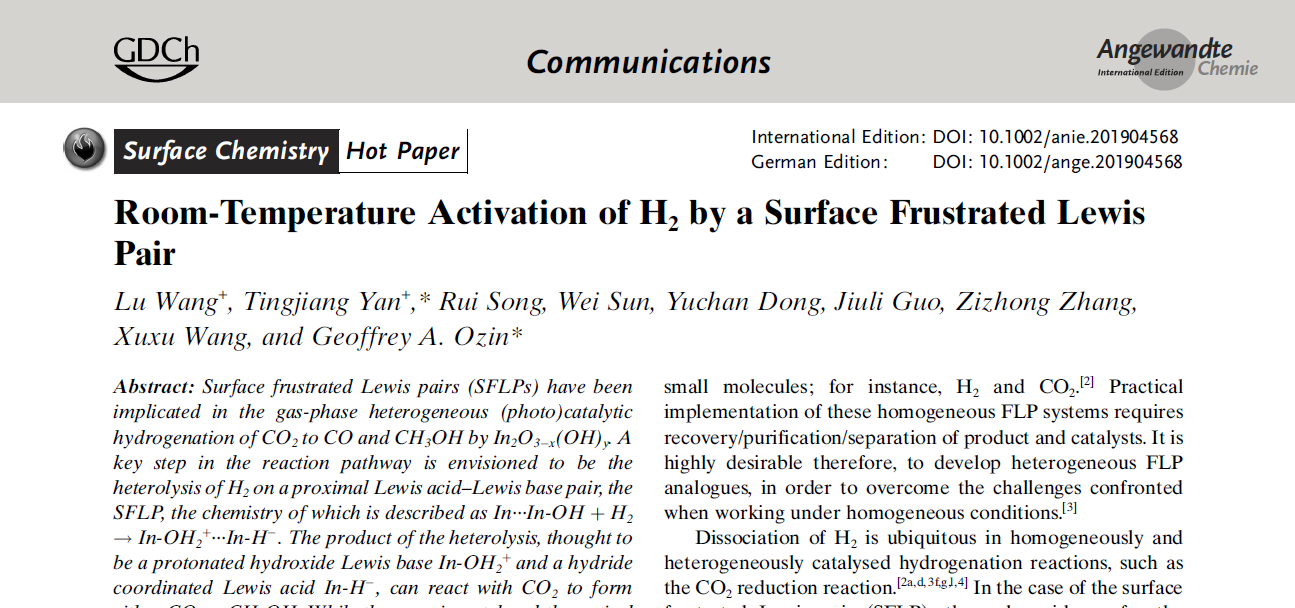 为第一署名单位;第二篇论文为“Room-Temperature Activation of H2by a Surface Frustrated Lewis Pair”(DOI:10.1002/anie.201904568)发表在化学领域顶级期刊《Angewandte Chemie International Edition》,并被编辑选为“Hot Paper”,颜廷江教授为共同第一作者与通讯作者,ACG漫画网