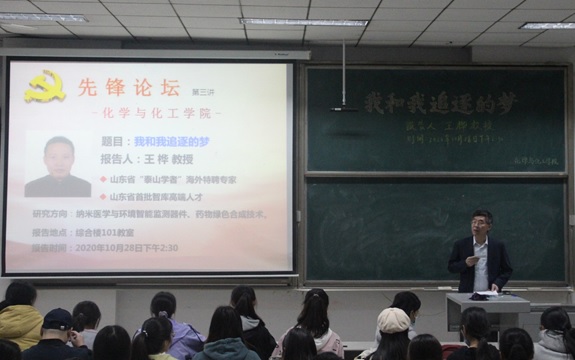 王桦教授的报告分为学术报告和非学术报告两大部分。在学术报告部分,王桦教授向大家深入浅出地介绍了所从事的科研工作,包括可穿戴式医学无线监测器件(医学AI),河海污染物远程监测系统(环境AI),以及肿瘤等疾患治疗药物中间体的绿色合成技术等,并讲述了自己回国后在“产学研”协同创新以及技术成果推广应用等方面的创业历程。在非学术报告部分,王桦教授采用“抛砖”、“引玉”、“攻玉”三个篇章为在场的师生讲述了他的国内外求学和工作经历,特别是在美国和新加坡工作期间的所见所闻。在“抛砖”篇,王桦教授声情并茂地讲述了自己的大学求学、工厂工作、考研、读博、留校工作、出国深造、以及归国创新创业的追梦之旅,生动形象地演绎了自己从一个农村娃到大学生,从一个工厂技术员“回炉”成为研究生,从一个国内大学教授到海外知名学者以及海归专家的传奇经历,展现了由“泥”娃历练成“砖”家的过程,让在场师生不由惊叹一声:“王侯将相宁有种乎!”。在“引玉”篇,王桦教授向在座师生介绍了自己接触到的海内外学术大师和名家,并分享了大师们矢志不渝的成才故事和“历炼成钢”的励志经历;在“攻玉”篇中,王桦教授引用了美国西点军校的校训“态度决定一切”,论述了一个人有什么样的心态,就会有什么样的人生追求和成就,号召大学生们要确定好自己的人生目标,规划好未来的人生方向,尤其要拥有成功的自信心和立志成为“化学家”的事业心,进而借用哈尔滨工业大学“规格严格,功夫到家”的校训,向大家说明了化学科研工作中的“细节决定成败”。最后,王桦教授以“既然选择了远方,便只顾风雨兼程”作为报告的结尾,勉励大家不仅要有“诗和远方”的梦想,更要有务真求实、“咬定青山不放松”坚韧不拔的执念和抗压能力,利用大学阶段的美好时光,打好学业基础,为未来实现自己的远大理想和人生价值而奋斗。在最后的自由提问环节中,王桦教授就同学们提出的如何选择考研专业和导师等问题做了耐心的解答,言谈幽默风趣,深入浅出,引经据典,赢得了在座师生的阵阵掌声,为本次论坛的成功举办画上了圆满的句号。