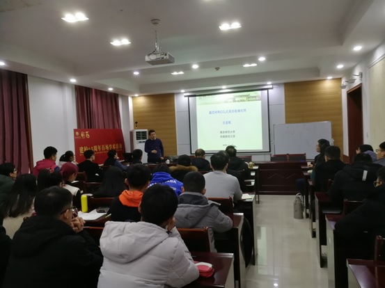 报告伊始,赵琪书记对专程前来的兰亚乾教授表示了热烈欢迎,并对兰老师的学习和工作经历作了详细的介绍,之后报告会正式开始。兰教授基于当前能源和环境领域中存在的重大科学问题,重点介绍了晶态光电催化材料的合成以及在电催化和光催化CO2还原中的应用。在介绍专业知识的同时,还以几个典型的实例启发大家如何挖掘课题的创新点,使科研成果更上一个台阶。另一方面兰老师也告诫在座的同学们要相信自己,勤于思考,只要肯付出就能取得成功!兰老师的报告内容丰富,既有专业学术知识,又有生动实例,引起了参会者的极大兴趣。报告中,兰教授还介绍了华南师范大学的发展历史,并重点介绍了化学院的研究生招生政策,也非常欢迎曲师大学子加入华师大继续攻读硕士和博士生。