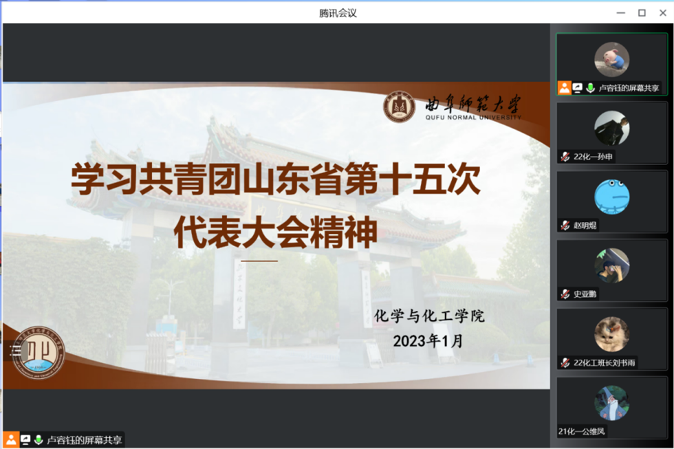 于腾讯会议线上学习共青团山东省第十五次代表大会精神。本次会议由学院团委副主席卢容钰主讲,学院各年级团干部,团委、学生会主要学生干部骨干参加。