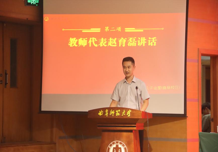 图为教师代表赵育磊发表讲话