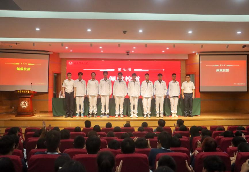 随后,学校团委书记孔轶众、学院党委书记赵琪共同为2023级新生代表佩戴校徽。