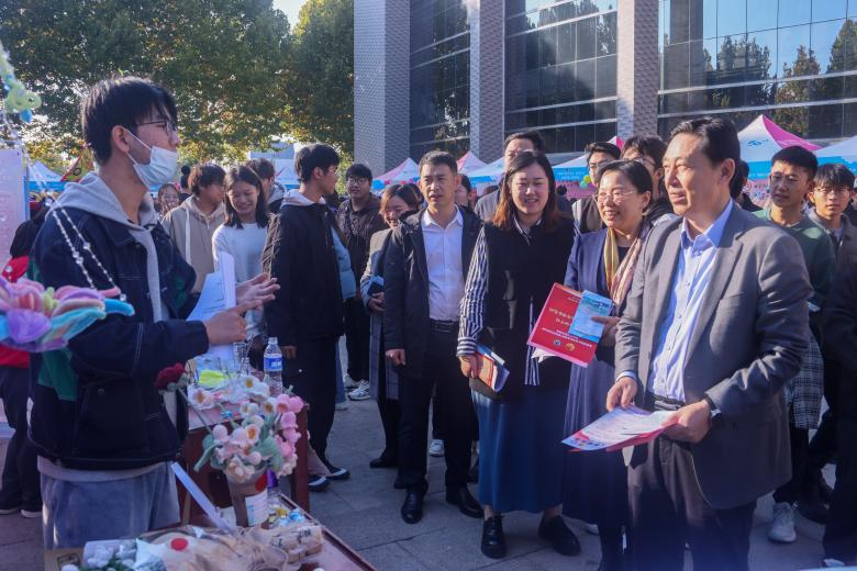 图为学校领导老师听取学院学生讲解项目