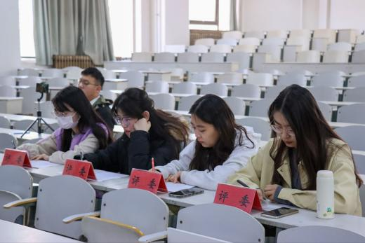图为比赛现场评委评分