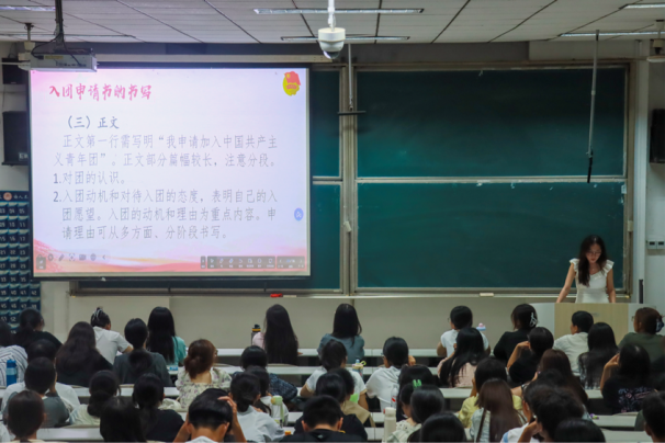 图为学院团委组织部部长庞亚楠讲解入团申请书的书写格式和内容