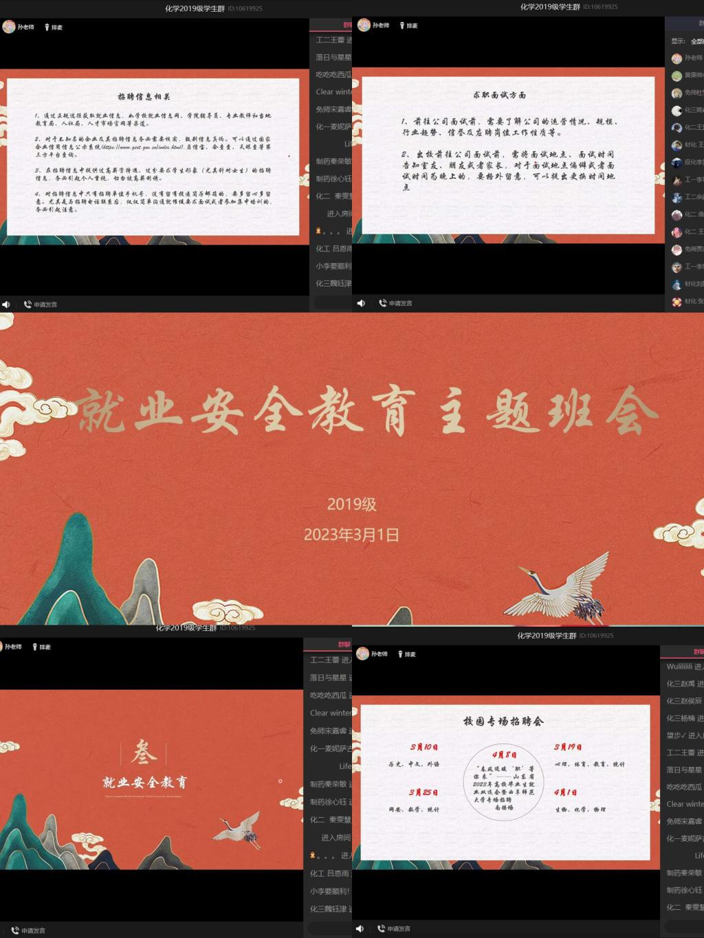 为了更好地开展毕业生就业工作,提高学生的自我防范意识,加强社会活动能力,保障学生安全稳定工作。3月1日,化学与化工学院组织召开2023届毕业生就业安全教育主题班会。